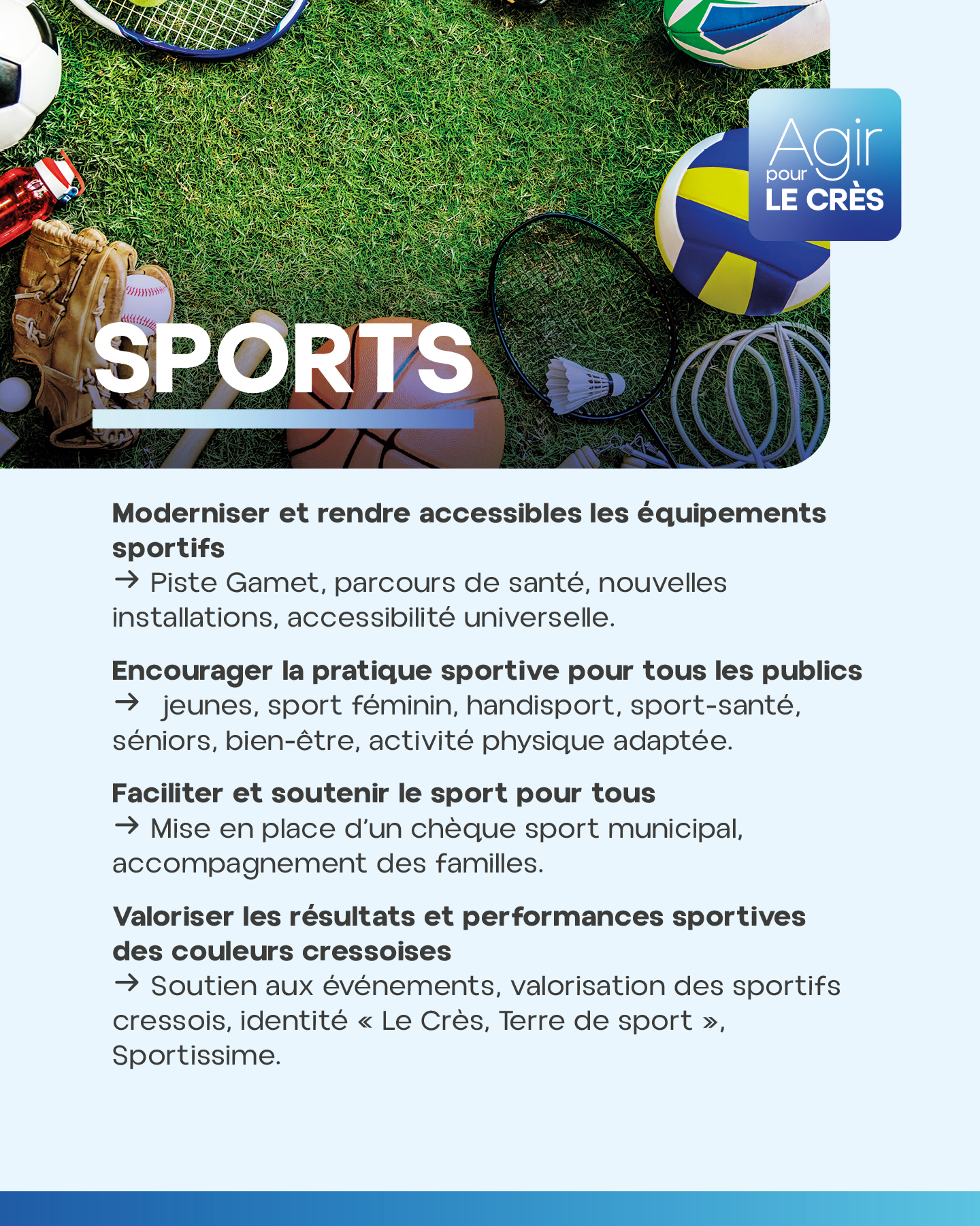➡️ BIEN GRANDIR AU CRÈS : SPORTSPar Agir pour le Crès / 24 février 2026 ✅ Moderniser et rendre accessibles les équipements sportifs ✅ Encourager la pratique sportive pour tous les publics ✅ Faciliter et soutenir le sport pour tous ✅ Valoriser les résultats et performances sportives des couleurs cressoises Facebook Twitter