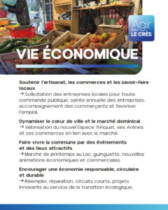 ➡️ BIEN S’ÉPANOUIR AU CRÈS : VIE ECONOMIQUEPar Agir pour le Crès / 28 février 2026 ✅ Soutenir l’artisanat, les commerces et les savoir-faire locaux ✅ Dynamiser le cœur de ville et le marché dominical ✅ Faire vivre la commune par des événements et des lieux attractifs ✅ Encourager une économie responsable, circulaire et durable Facebook Twitter